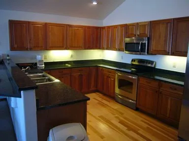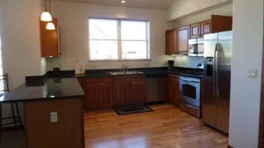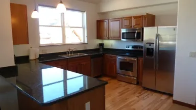 Fully-equipped Kitchen with hardwood floors and granite countertops.