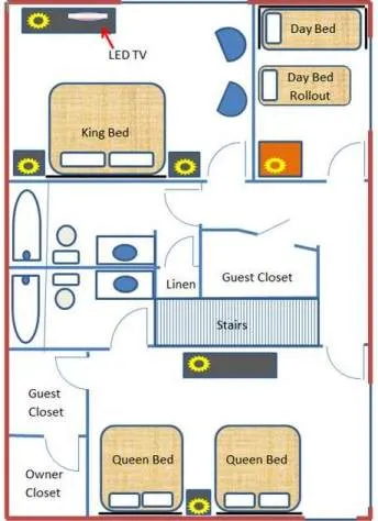 The King Bedroom and Day Room share the king bath and a spacious walk-in closet where you'll find extra bedding as well as two twin-size foam mats and two twin-size inflatable beds.