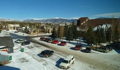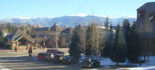 View from the Great Room of 6th Avenue and Main Street against the backdrop of the Williams Fork Mountains and the Ptarmigan Peak Wilderness to the northeast. April 8, 2010. At that intersection, catch the free Summit Stage bus to Breckenridge, Keystone, or Copper Mountain.