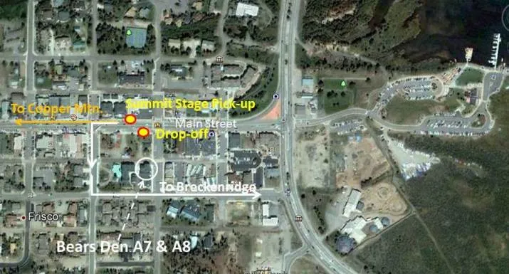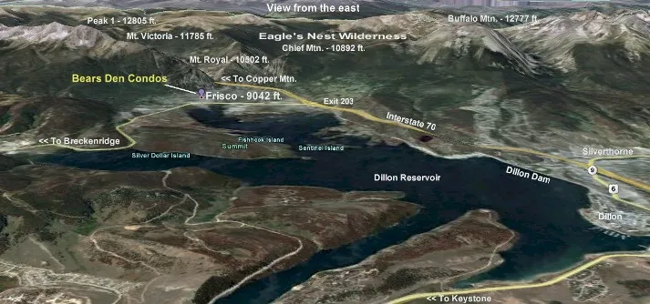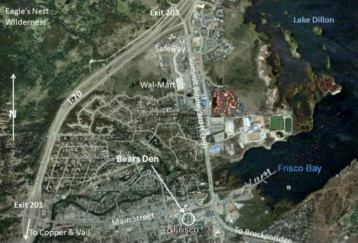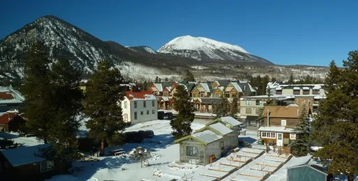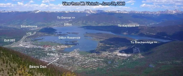with views of Chief and Buffalo Mountains, Main Street, the Frisco community gardens, and the distant Ptarmigan Peaks Wilderness.