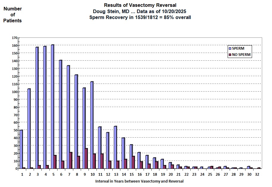 One other point worth repeating ... If the lower end fluid on both sides is of such poor quality that vas-to-vas connections are not performed (because they would be unlikely to result in sperm return to the semen), the patient is entered into the database as a case of "NO SPERM" and "NOT PREGNANT" even though a vasectomy reversal was technically not performed. So many patients represented within the red columns did not have vasectomy reversals. But it is necessary to include them within the data presented to a couple BEFORE we know the quality of the man's lower end fluid.