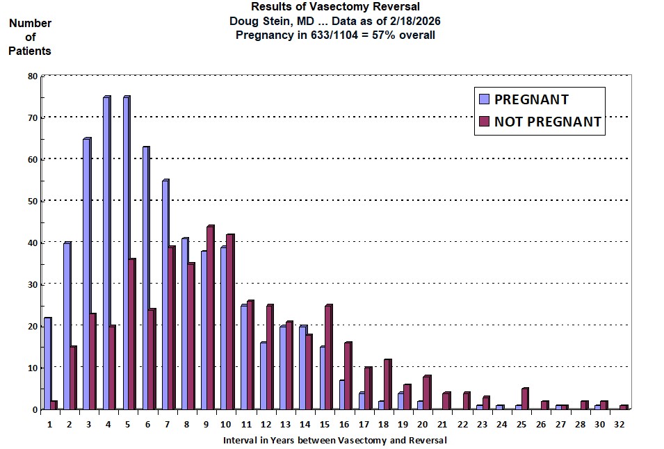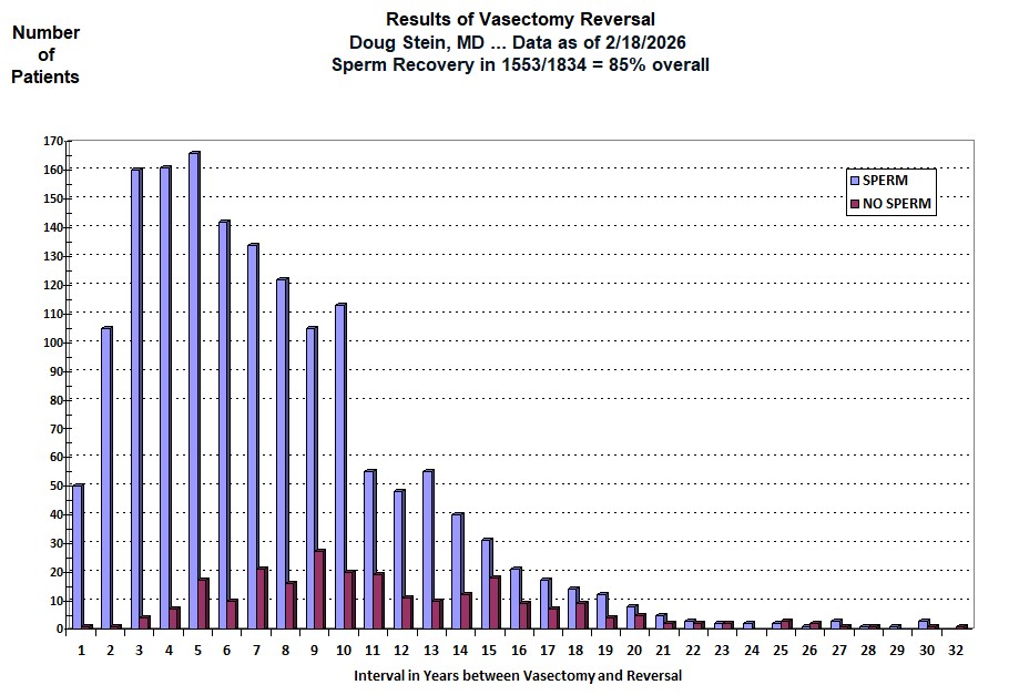 *** - Notice that the number of patients contributing to the pregnancy database is considerably smaller than the number of patients contributing to the sperm recovery database. Almost all patients send or bring in a semen sample after reversal, so sperm recovery rates reflect the vast majority of patients who undergo vasectomy reversal. Couples are added as "NO PREGNANCY" only if it has been one year since the reversal and they have failed to conceive. When we have tried to call our reversal patients who have recovered sperm, we've gotten a variety of responses: "the number has been disconnected," "no-one by that name lives here," "we're separated," "my husband lost his job and money is tight right now so I'm back on the pill," "I got a breast tumor and was told that pregnancy could stimulate my cancer if not fully cured," "we didn't plan on getting pregnant right away, but had you do the reversal to increase our likelihood of success in a few years," "my father died and now I have to take care of my Alzheimer's mother and there is no way I can take care of a baby" and the list goes on. Sometimes we learn about a pregnancy of which we were unaware and another success is added to the data. Sometimes we learn that a couple has been trying for more than a year but sperm density or motility is very low, and another pregnancy failure is added to the data. Sometimes we learn that sperm density or motility is low and the wife has endometriosis or had to have a tube and ovary removed, and we are not sure whether entering the case as a pregnancy failure is justified. Or a patient with a perfectly normal semen analysis gets divorced 9 months after his reversal and his new partner has already had her tubes tied: can't enter him as a pregnancy failure or success. Thus the many reasons for the difference in the total numbers of patients included in the two graphs.