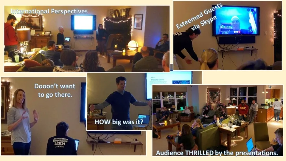 Seated on sofa: Paul, Renee Johannensen (West Windsor, VT), Dedra Smith (World Vasectomy Day, Fruita, CO), Maryann Stein, Henry Demediuk, Melanie Savard-Cote (St. Eustache, QC), Paul Evans (Plymouth, UK), Quinn and Danielle Zola, Nate Zola and Carla, Ginger.